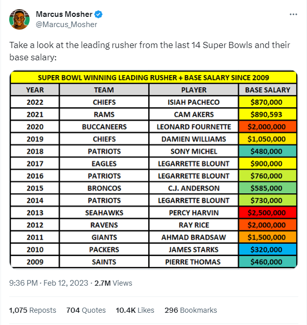 NFL fans are finally waking up to the fact that teams don’t prioritize running backs, and some are even realizing the better the team the less likely they are to place premium $ on the position in total. This tweet has made the rounds across social media, but it’s very accurate – in the NFL, money must be allocated precisely and efficiently across the most productive positions and running back isn’t one of them, it’s just how it is and it has been for some time.