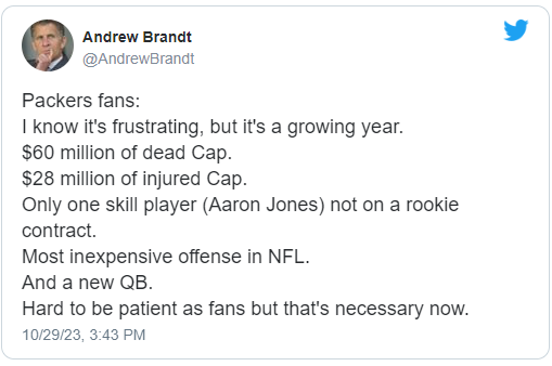 Finally, to put a bow on the weekly Talking People Off the Ledge rant, here’s some great perspective on the Packers’ current situation which was due to kicking the can down the road to appease Aaron Rodgers while paying him a gargantuan contract TWICE!