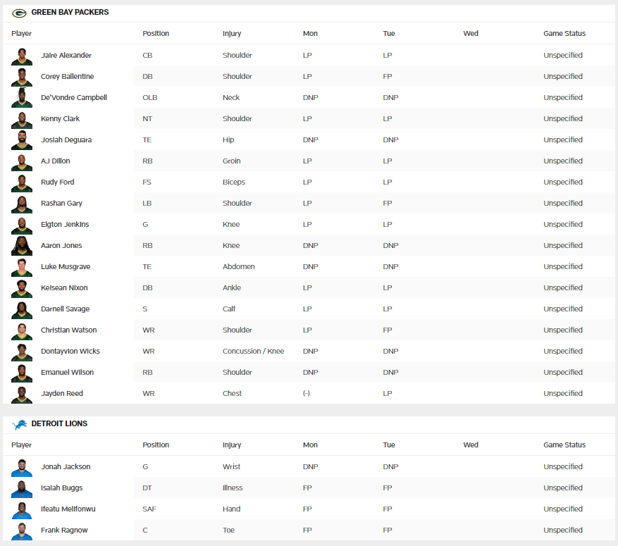 Thirteen of the players listed on the Packers’ injury report are Day 1 starters. The DNP (Did Not Practice) alone are all key starters: De’Vondre Campbell; Josiah Deguara; Aaron Jones; Luke Musgrave. Deguara seems to be working himself out of a job, however with the injury to Musgrave, the Tight Ends will be Tucker Kraft and Josiah Deguara…and they’ll be used frequently, hopefully. Running backs A.J. Dillon and newly re-acquired Patrick Taylor should get a decent work load in the game to alleviate pressure in the pass game…also, maybe there might be a coupe of shot plays to Watson and Reed to try to make up for lost yardage from Musgrave and Jones being OUT.