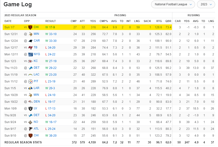 The Packers totaled 5 sacks cutting Justin Fields down for 31 yards in those takedowns. The Packers also held the #1 rushing offense (entering the game) to 75 yards on 25 attempts (3.0 yards/rush), which is incredible. Play man coverage, bring a blitzer or two every once in a while, and get Lukas Van Ness more snaps…he plays well and produces when he’s on the field.