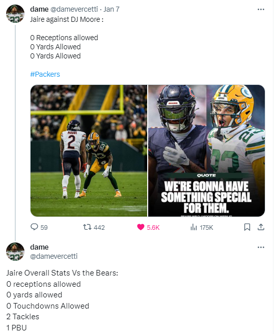 The Packers totaled 5 sacks cutting Justin Fields down for 31 yards in those takedowns. The Packers also held the #1 rushing offense (entering the game) to 75 yards on 25 attempts (3.0 yards/rush), which is incredible. Play man coverage, bring a blitzer or two every once in a while, and get Lukas Van Ness more snaps…he plays well and produces when he’s on the field.
