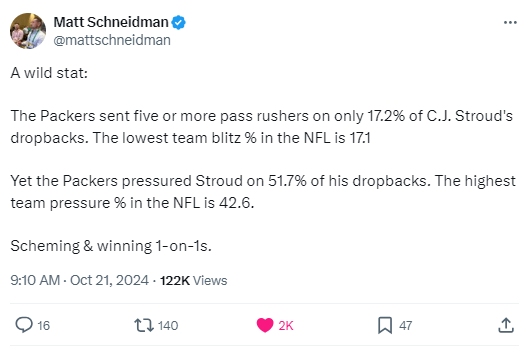 The defense allowed them to overcome a -3 turnover differential, which is nearly impossible, and losing the time of possession 31:17 to 28:43 and still win the game. Generating that much pressure kept C.J. Stroud in hell for much of the game, resulting in 55 net passing yards on 21 pass attempts. That’s incredible, nothing short of it. Of Houston’s 12 drives, the Packers forced 6 punts, with another being a kneel down to end the half. To put it in Points Per Drive perspective, the Texans scored 1.83 points/drive, whereas Green Bay scored 2.18. There’s the difference.