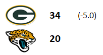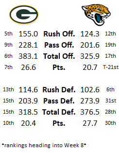 The Packers are a middle-of-the-road defense in essentially every category but are tops in the league by taking the ball away, even after not getting a single turnover in their last game. Jacksonville is very good at not giving the ball away (7 giveaways) ranking T-8th. Green Bay and Jordan Love should have a great opportunity to have a big game through the air considering the Jags rank 2nd-to-last in the NFL in passing yards surrendered, with 273.9 yards/game. The Jags are also getting scorched in Points Given Up, ranking 2nd-to-last in that category as well. This is due to Jacksonville ranking 24th in 3rd Down Conversion rate at 34.18%, while Green Bay ranks 13th (40.48%), per teamrankings.com.