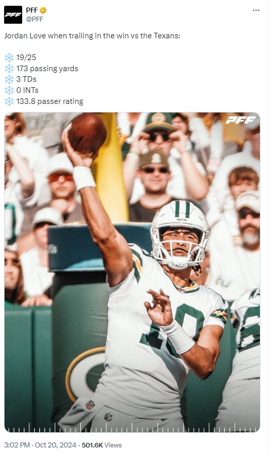 The Packers, and Jordan Love, showed extreme resiliancy throughout the entire contest vs. Houston. While the Texans were missing 5 defensive starters, they’re a very good football team that’s extremely well-coached, and it showed. Houston was able to generate pressure against, arguably, the best offensive line in the NFL and forced an interception by doing so. Love had a few miss throws/decisions that led to 2 interceptions, but he kept slingin’ it. With 7 total lead changes throughout the game, the Packers had multiple (6) drives when trailing. Of those six drives, the Packers scored on 4 of them, accumulating all of their 24 points in doing so, with the last drive securing the victory in walk-off fashion.