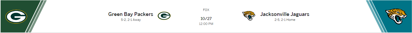 The Packers are a middle-of-the-road defense in essentially every category but are tops in the league by taking the ball away, even after not getting a single turnover in their last game. Jacksonville is very good at not giving the ball away (7 giveaways) ranking T-8th. Green Bay and Jordan Love should have a great opportunity to have a big game through the air considering the Jags rank 2nd-to-last in the NFL in passing yards surrendered, with 273.9 yards/game. The Jags are also getting scorched in Points Given Up, ranking 2nd-to-last in that category as well. This is due to Jacksonville ranking 24th in 3rd Down Conversion rate at 34.18%, while Green Bay ranks 13th (40.48%), per teamrankings.com.