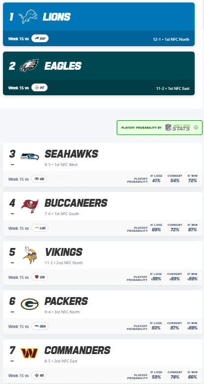 It’s been well-talked about, that Green Bay’s only losses have come to the teams ahead of them in the NFC. While that means they don’t have a “bad loss,” it does say that they’re not able to beat any of the teams necessary to advance in the playoffs. The Packers wins have come against teams with a combined record of 69-99 (.411), and their four losses against teams with a combined record of 51-9 (.850). If you break it down, the Packers have a record of 3-4 against teams with a winning record. Not bad, however the only teams they’ll likely see in the playoffs that they’ve beaten is the LA Rams…and Green Bay caught them without their top 2 pass catchers and a couple of key defenders. Since Cooper Kupp and Puka Nacua have returned to the lineup, LA has been 7-2 with convincing wins vs. both Minnesota and Buffalo. They could be a force to be reckoned with, and their 9-6 record is misleading, considering they “lost” to Chicago and Arizona in the early part of the season.