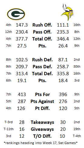While this game isn’t meaningless for Green Bay, it means a helluva lot more to Minnesota. The Vikings have control of their destiny to obtain the highly-coveted 1-seed (should they win v. Green Bay then next week v. Detroit). The Packers are locked into either the 5, 6, or 7-seed, but if they win 1 of their remaining two games, would guarantee either the 5th or 6th seed. Where this game is important for Green Bay is to see if they can log their “best win of the season.”