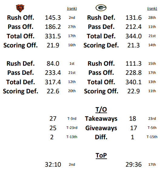 While I said you can throw the stats out the window, it’s important to view them to see truly where each team stands in the NFL. Green Bay is top-10 in every ranking aside from Passing Offense (12th), Passing Defense (17th), and Giveaways (T-11th). That’s as balanced a team in the entire NFL. The truest stat for Power Rankings (in my opinion) is overall point differential. Green Bay sits at 5th in the NFL where Chicago ranks only 23rd while riding their 10-game losing streak. That alone would tell you Chicago is “better” than their 4-12 record while Green Bay destroys teams worse than them and barely loses to better teams.